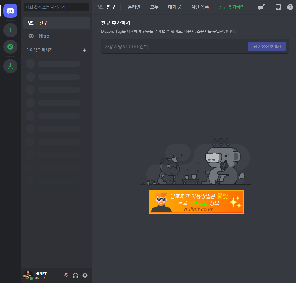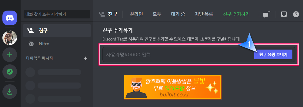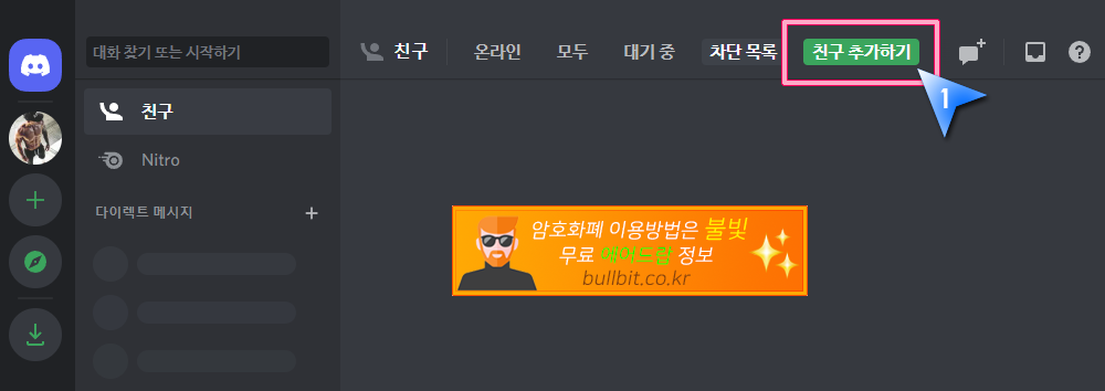1. 디스코드 메인화면 상단의 "친구 추가하기" 버튼을 클릭합니다.