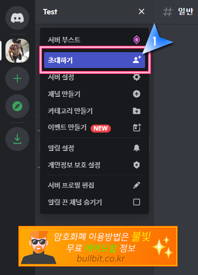 5. 서버를 만들었으니 누군가 초대를 해야겠죠? 초대하기 버튼은 위쪽의 화살표를 클릭하거나 방금 개설한 서버 아이콘에서 마우스 우측 버튼을 누르면 '초대하기' 버튼을 찾을 수 있습니다.