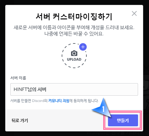 4. 서버이름을 입력하고 "만들기" 버튼을 클릭합니다. 아이콘을 입력하시면 다른 사람들이 좀 더 쉽게 찾을수 있으니 특별한 목적의 커뮤니티를 만들때는 아이콘을 입력해주시는 것이 좋습니다.