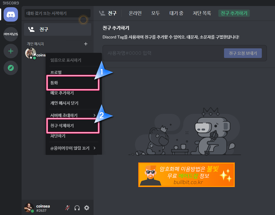 2. 친구의 디스코드 아이디(사용자명#0000)를 입력한 후, 친구에게 친구요청하기를 보냅니다. '친구에게 성공적으로 친구 요청을 보냈어요'라고 메시지가 뜨고 이를 친구가 수락을 해주면 친구가 추가됩니다.