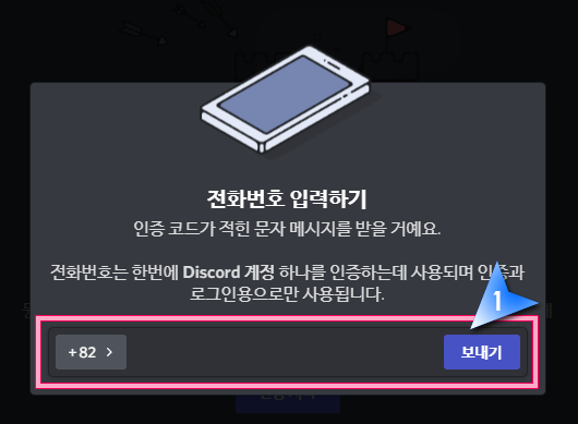 10. +82(대한민국)이 보이지 않으면 '대한민국'이라고 입력하면 +82를 찾을 수 있습니다. 휴대폰 번호를 입력한 후, "보내기" 버튼을 클릭해주세요. 그리고 +82가 들어가는 휴대폰 인증은 휴대폰 번호의 맨 앞자리 0을 제외한 나머지를 입력해야 정상적으로 문자가 도착합니다. 예를 들어 자신의 휴대폰 번호가 010-1234-5678이라고 하면 +82 다음에 1012345678로 입력하시면 됩니다.