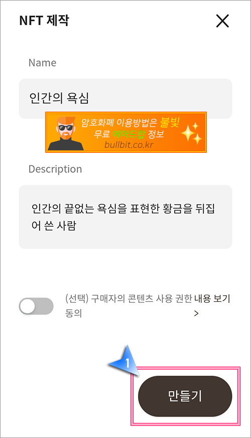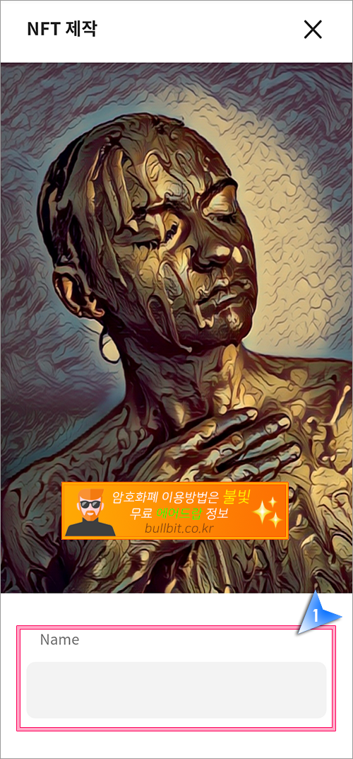 3. 저는 이미 만들어 놓은 이미지 하나를 마이템즈에 등록을 해보겠습니다. 인간의 욕심을 표현한 황금을 뒤집어쓴 사람을 표현하는 이미지입니다. 간단하게 Name에 NFT 이름을 적고 Description에는 설명을 적어주시면 됩니다.