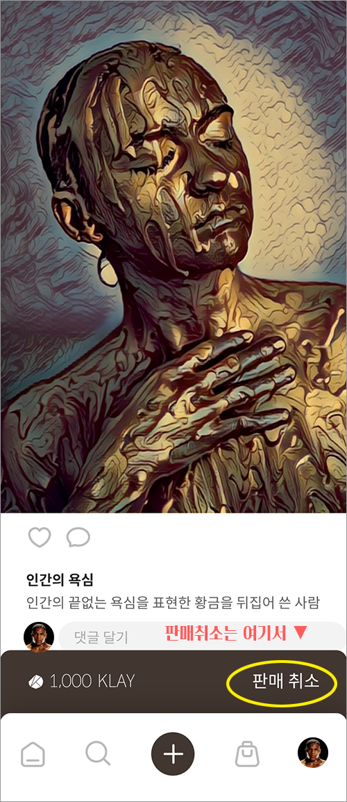 6. 이렇게 NFT의 판매가 등록이 되었고, 판매를 취소하고 싶으시다면 "판매 취소" 버튼을 눌러주시면 되겠습니다.