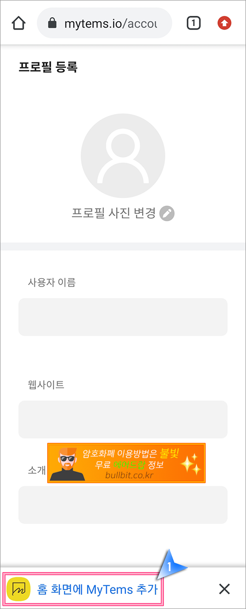 6. 마이템즈의 가입이 아주 간단하게 완료되었습니다. 마이템즈도 메타마스크나 카이카스를 연결해서 사용하는 오픈씨와 비슷한 형태라고 보시면 됩니다. 마이템즈 프로필을 등록하는 화면입니다. 간단하게 등록하시면 됩니다. 휴대폰 바탕화면에 마이템즈를 꺼내놓고 싶으신 분들은 "홈 화면에 마이템즈 추가" 버튼을 클릭하시면 됩니다.