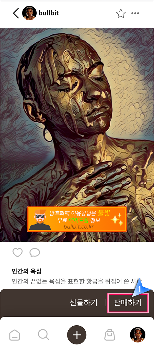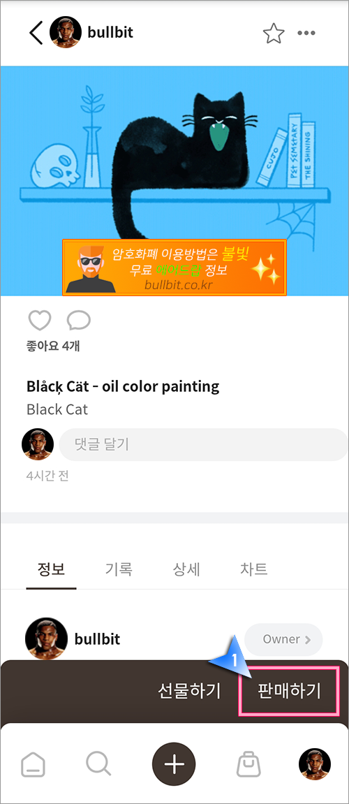 8. 이렇게 방금 구매한 신청한 NFT가 구매가 완료되었습니다. 하단의 '판매하기' 버튼을 눌러서 다시 재판매 등록을 해도 되고 누군가에게 선물하고 싶다면 '선물하기' 버튼을 클릭해서 상대방에게 전달할 수도 있습니다.