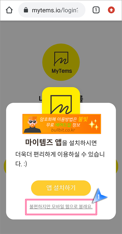2. 앱을 설치해서 이용해도 되지만 저처럼 휴대폰에 뭘 설치하는 것을 싫어하시는 분들은 그냥 "불편하지만 모바일 웹으로 볼래요"를 클릭합니다. '불편하지만'이라는 말이 있지만 웹상에서 전혀 불편하지 않습니다.