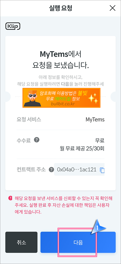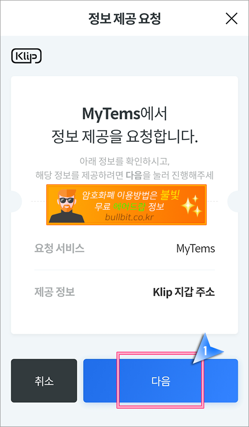 2. 또 다시 마이템즈와 카카오 클립을 연동하는 과정을 거칩니다. "다음" 버튼을 클릭합니다.