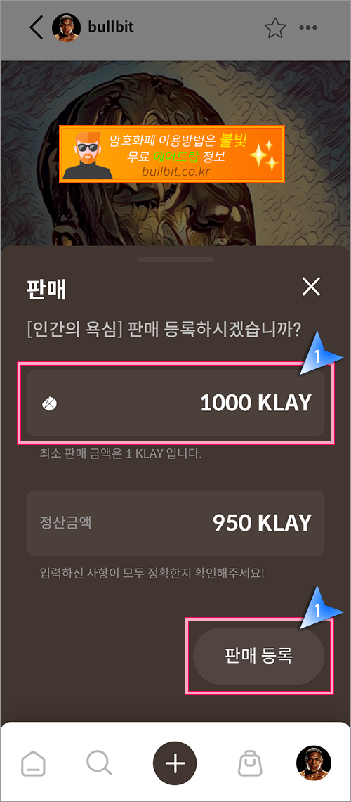 1. 위의 NFT 판매하기 버튼을 누르면 판매가격을 입력하는 부분이 나옵니다. 클레이(KLAY)로 진행되므로 자신이 팔고 싶은 가격을 클레이로 계산해서 넣으시면 됩니다. 현재 1클레이가 1,500원 정도이니 150만원에 팔고 싶다면 1,000클레이를 입력하면 됩니다. 저는 테스트로 올리는 것이라 누가 사지도 않겠지만 1,000클레이를 적고 판매를 해보겠습니다. 1,000클레이를 입력하니 정산금액이 950클레이로 나옵니다. 수수료가 5%라는 말이네요. 다 입력한 후, "판매등록"을 눌러주시면 됩니다.