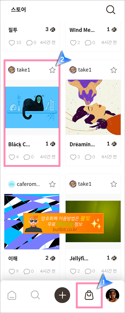 1. 이번에는 마이템즈에서 NFT를 구매하는 방법입니다. 화면 하단의 마켓 아이콘을 클릭한 후, 자신이 마음에 드는 NFT를 선택합니다.