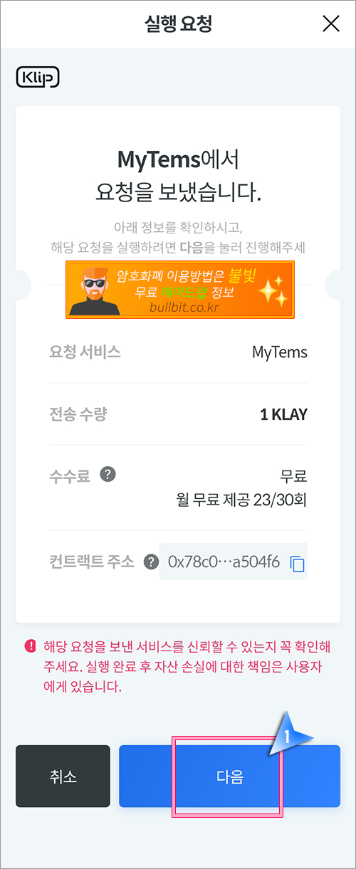 5. 카카오 클립과 연동되어 구매 금액을 결제하겠다는 내용으로 "다음" 버튼을 클릭합니다.