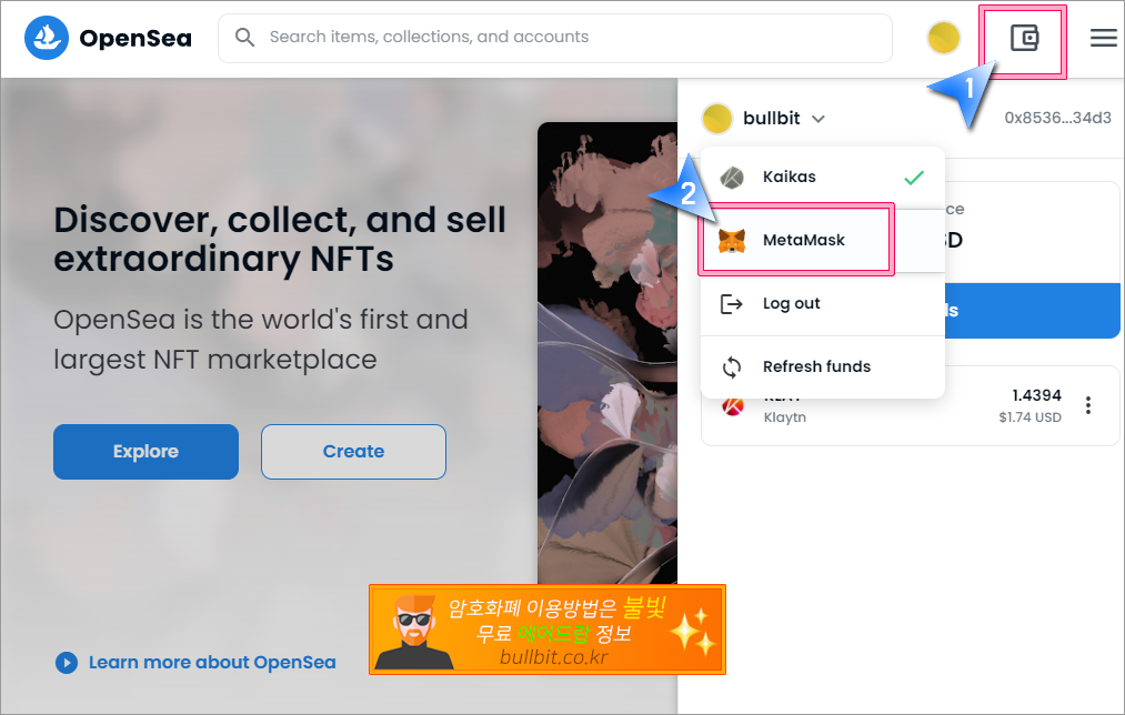 1. 오픈씨 우측 상단의 지갑 아이콘을 클릭한 후, MeatMask를 선택합니다.