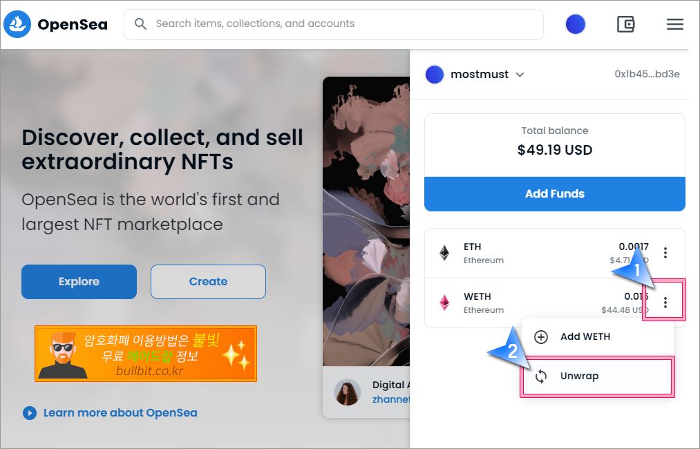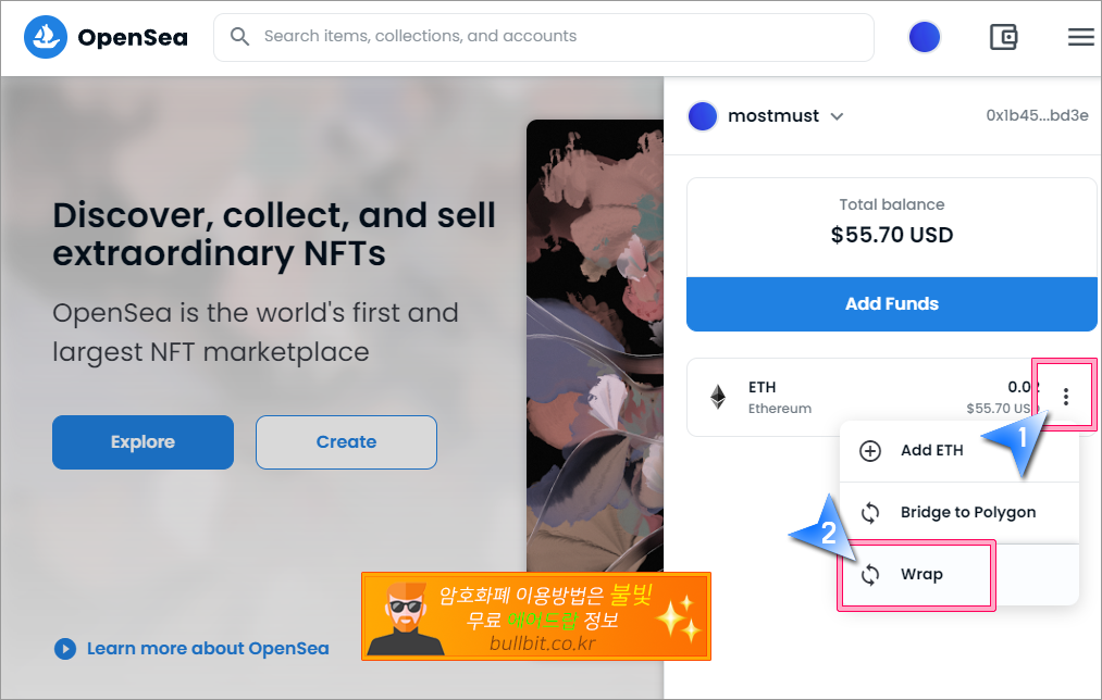 오픈씨에서 ETH를 WETH로 Wrap(랩) 하는 방법