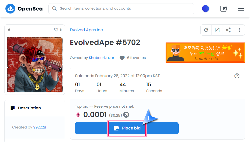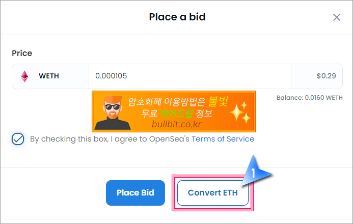 1. 경매에 참여할때 WETH가 필요한데 미리 WETH를 랩하지 못한 경우는 경매에 참여하면서 진행할 수 있습니다. "Place bid"를 클릭해서 경매에 참여합니다.
