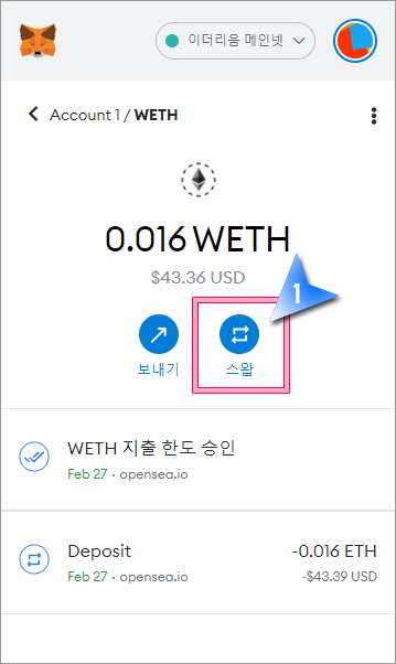 2. 메타마스크 WETH 잔액이 보이는 부분 하단의 "스왑"을 클릭합니다.