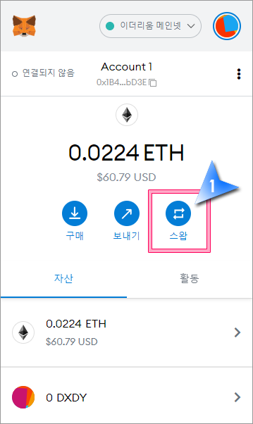 1. 메타마스크 ETH 잔액이 보이는 부분 하단의 "스왑"을 클릭합니다.