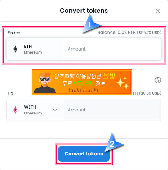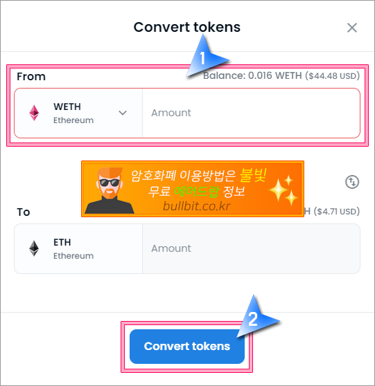 3. 랩 할 이더리움의 개수를 선택하고, "Convert tokens"을 클릭하고 진행하면 됩니다. 단 ETH를 전부 다 WETH로 랩하면 수수료를 사용할 이더리움이 없어서 랩이 진행되지 않습니다. 따라서 약간의 수수료 비용은 남겨놓고 진행하셔야 합니다.