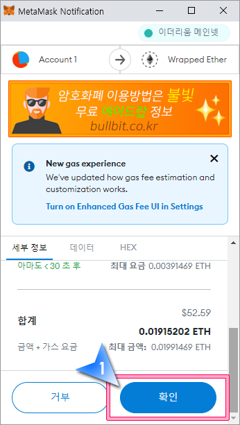 4. 메타마스크에서 가스비를 확인하고 "확인" 버튼을 클릭합니다.