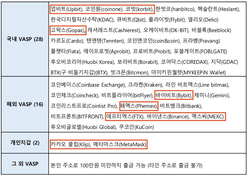 국내 가상화폐 거래소의 입출금 기준인 트래블룰에 의한 빗썸의 출금 가능한 국내외 VASP 목록은 22년 7월 6일 기준으로 아래와 같습니다.