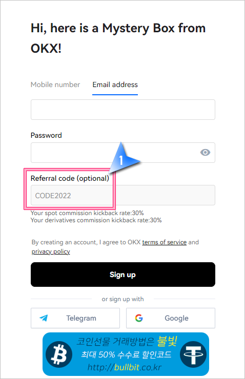 OKX 거래소 가입을 위해 위의 링크를 클릭하여 회원가입 페이지로 이동합니다. 회원가입 페이지에서 아이디와 비밀번호를 입력하시고 회원가입을 진행합니다. 레퍼럴 코드에 "CODE2022"를 입력하시고 프로모션 회원가입을 진행하고 로그인을 합니다.