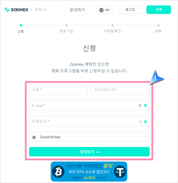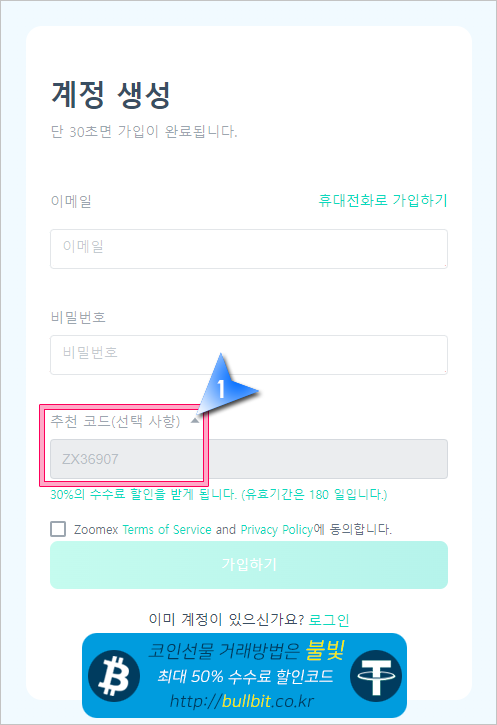 1. 위의 배너를 클릭하여 ZOOMEX 프로모션 회원가입을 합니다. 추천코드에 ZX36907 이 자동입력되지 않았다면 입력해주시면 30% 수수료 할인을 받게 됩니다.