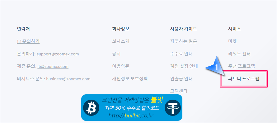 2. 회원 가입을 완료한 후, 주멕스에 로그인을 하고 화면 하단에서 "파트너 프로그램"을 클릭합니다.