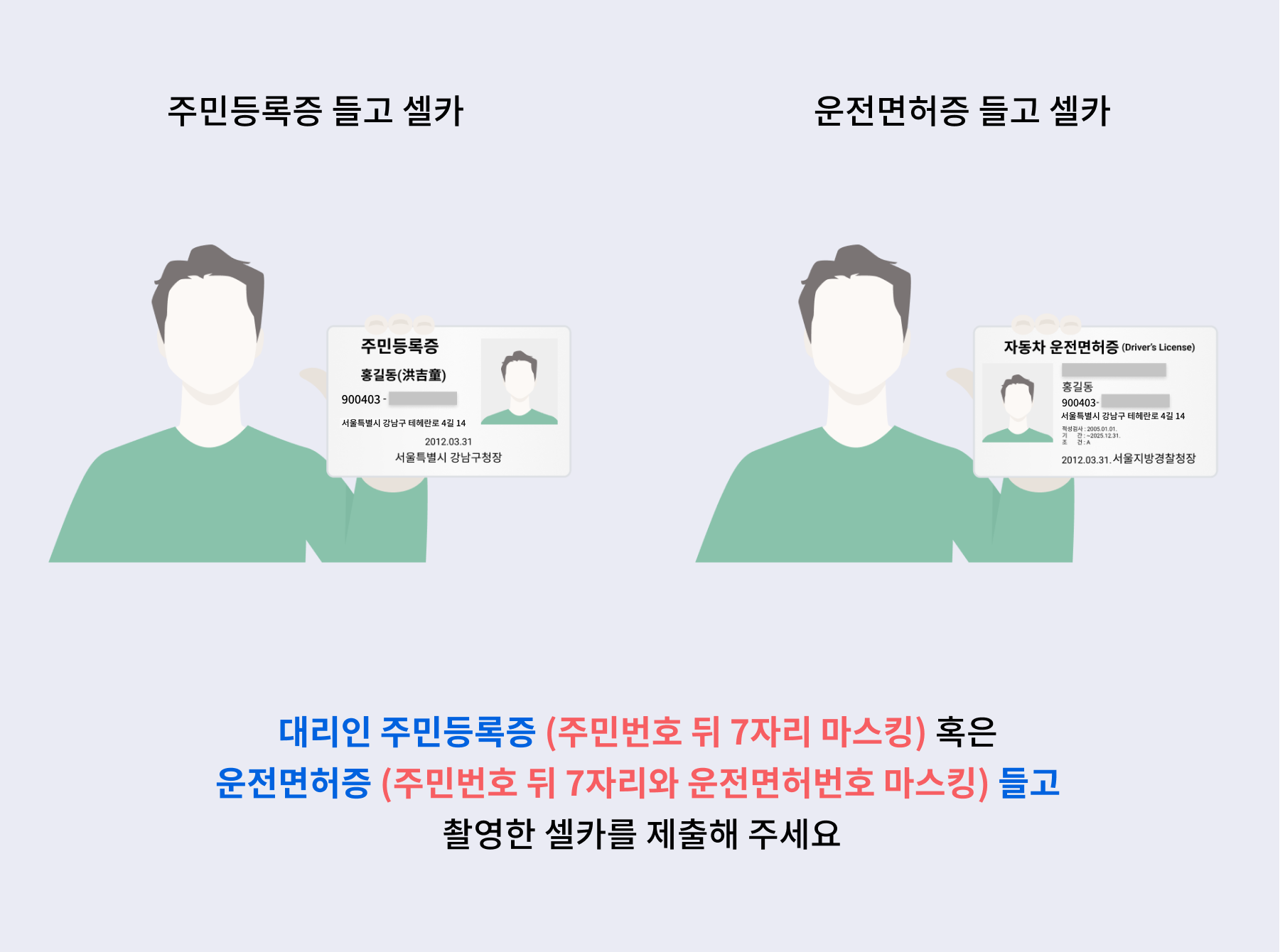 대리인의 신분증(주민등록증 또는 운전면허증 원본)은 이름과 생년월일만 노출해서 제출해 주세요. (주민등록번호 뒤 7자리와 운전면허번호는 가려야 정상 접수 가능)