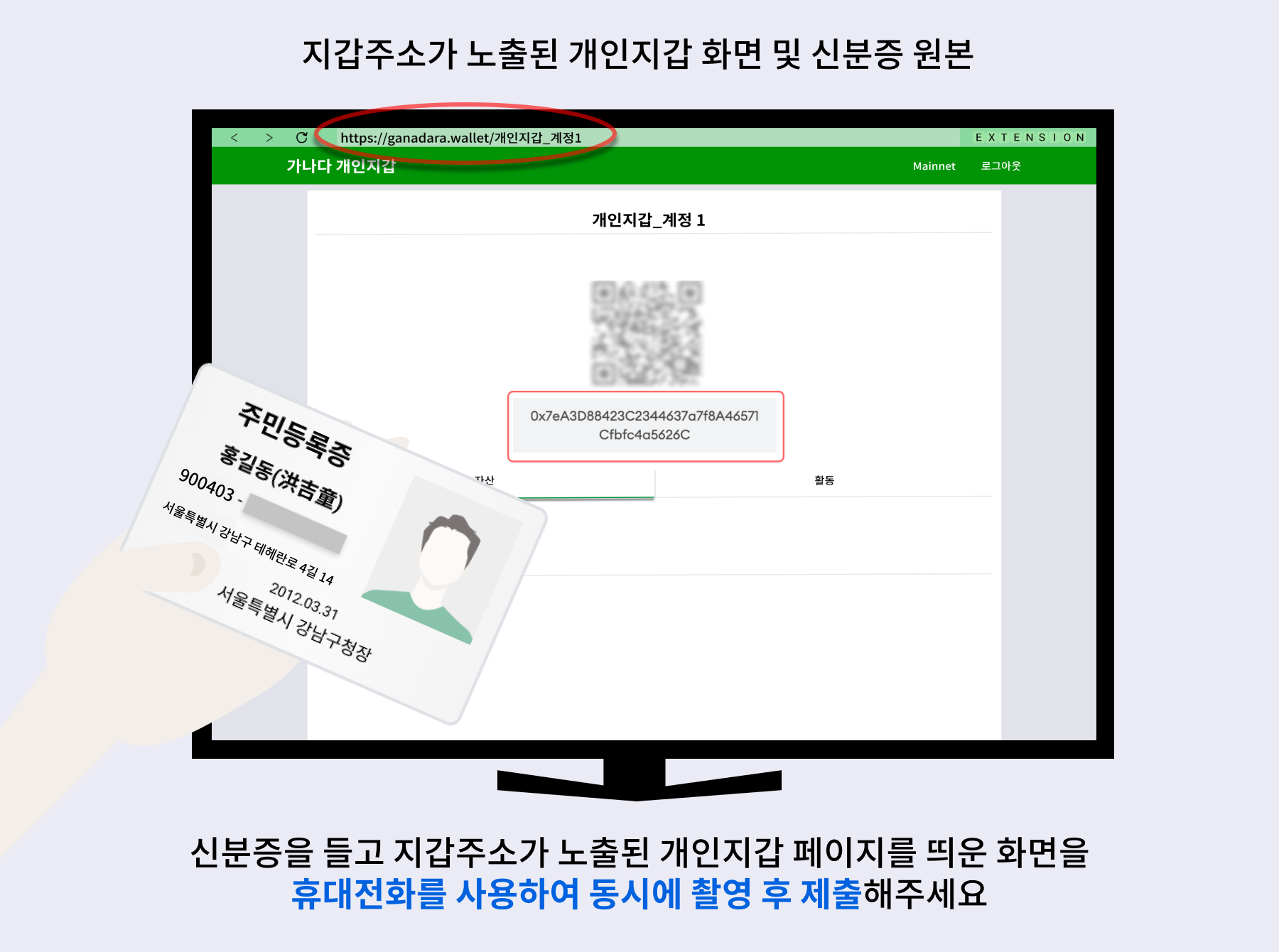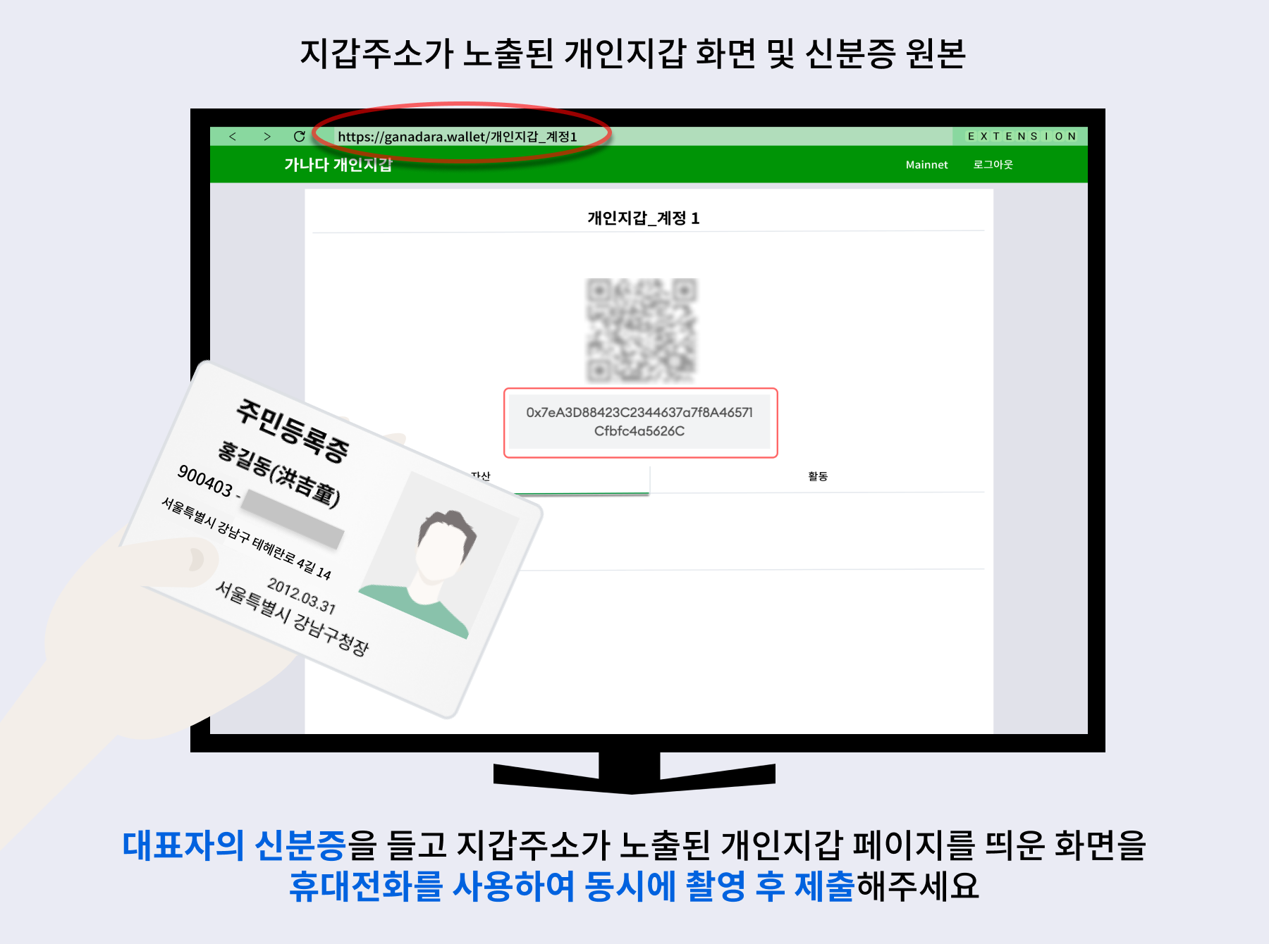- 개인 지갑일 경우 : 개인지갑 화면과 신분증 원본 동시 촬영 이미지