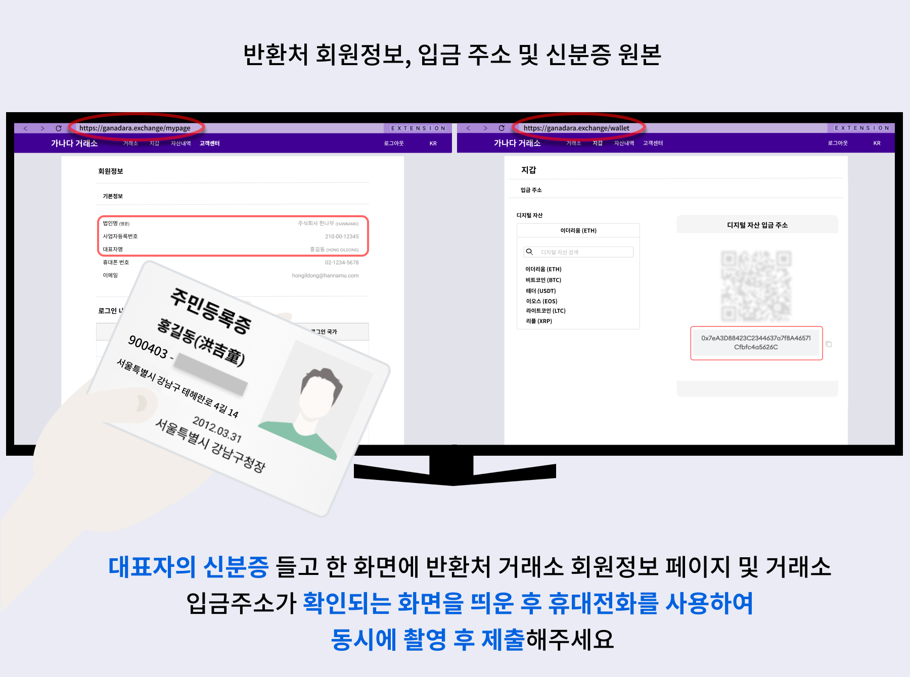 - 거래소 지갑일 경우 : 반환(입금) 거래소 법인 인증 정보, 입금 지갑주소, 대표자 신분증 원본 동시 촬영 이미지