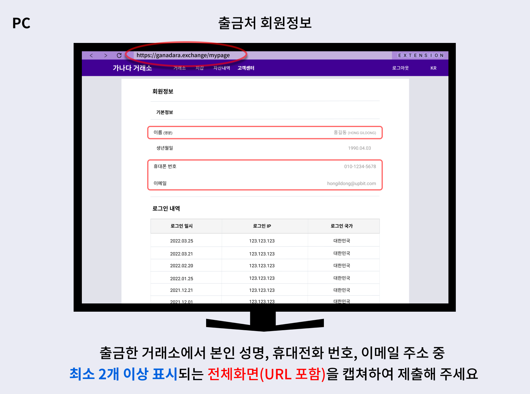 - 거래소(또는 개인지갑)에 로그인한 화면에는 계정정보, 출금주소 등이 노출되어야 합니다.