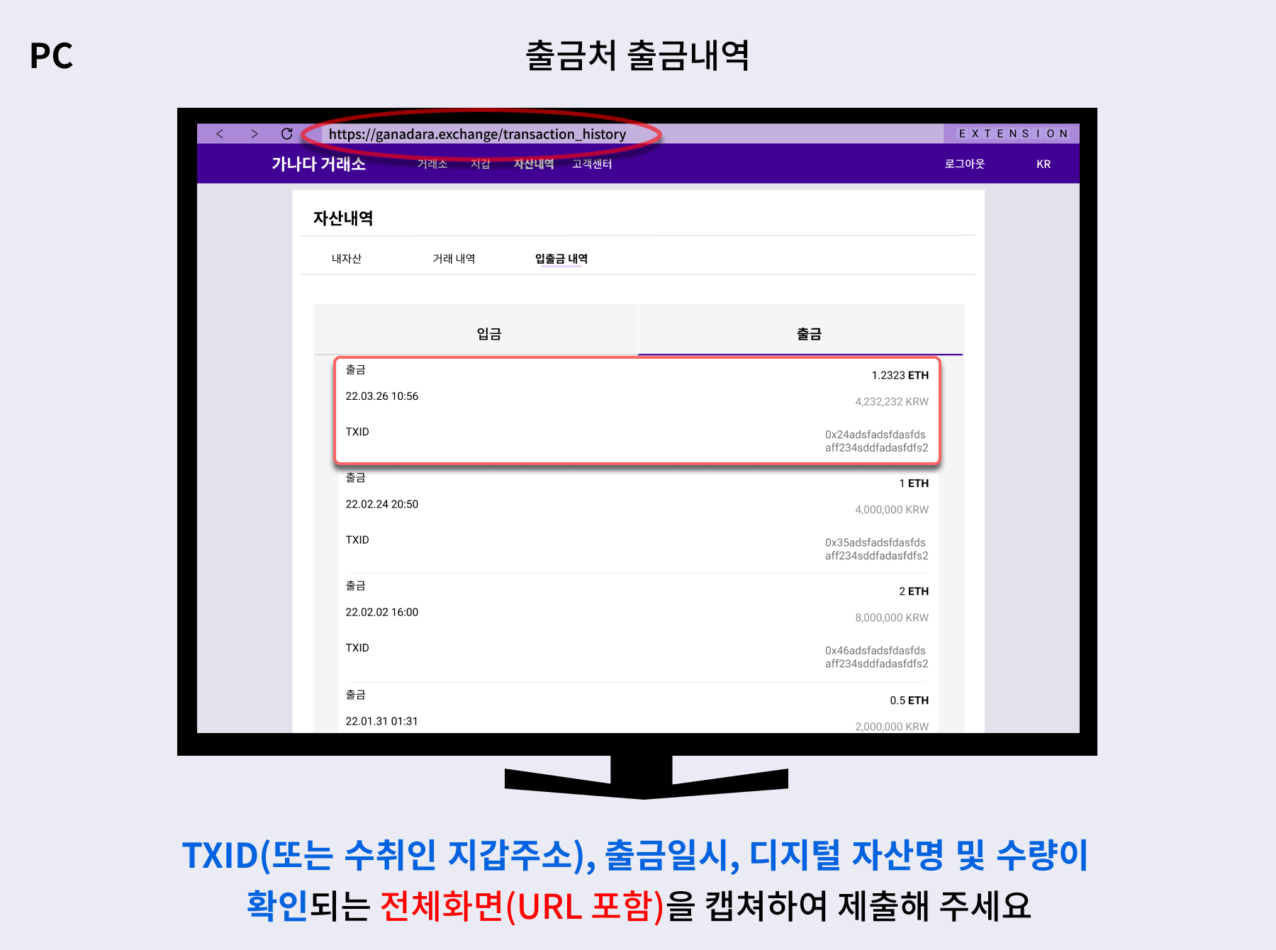 송금한 거래소 또는 개인지갑 내 출금내역 화면 캡쳐에 아래와 같이 확인되어야 합니다 :