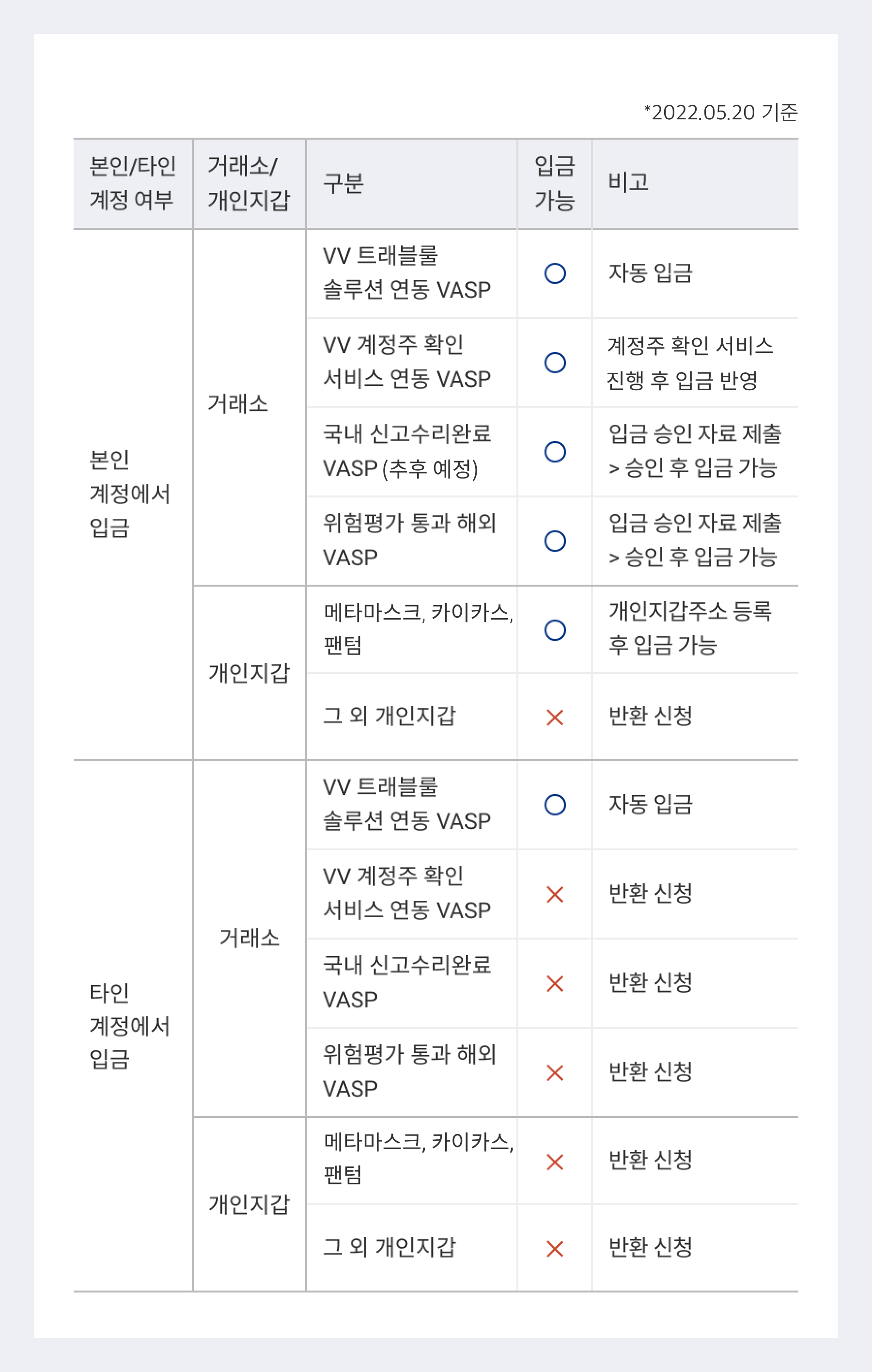 *트래블룰 미준수 혹은 출처가 불분명한 입금 건의 경우 회원님 계정으로 반영되지 않습니다.