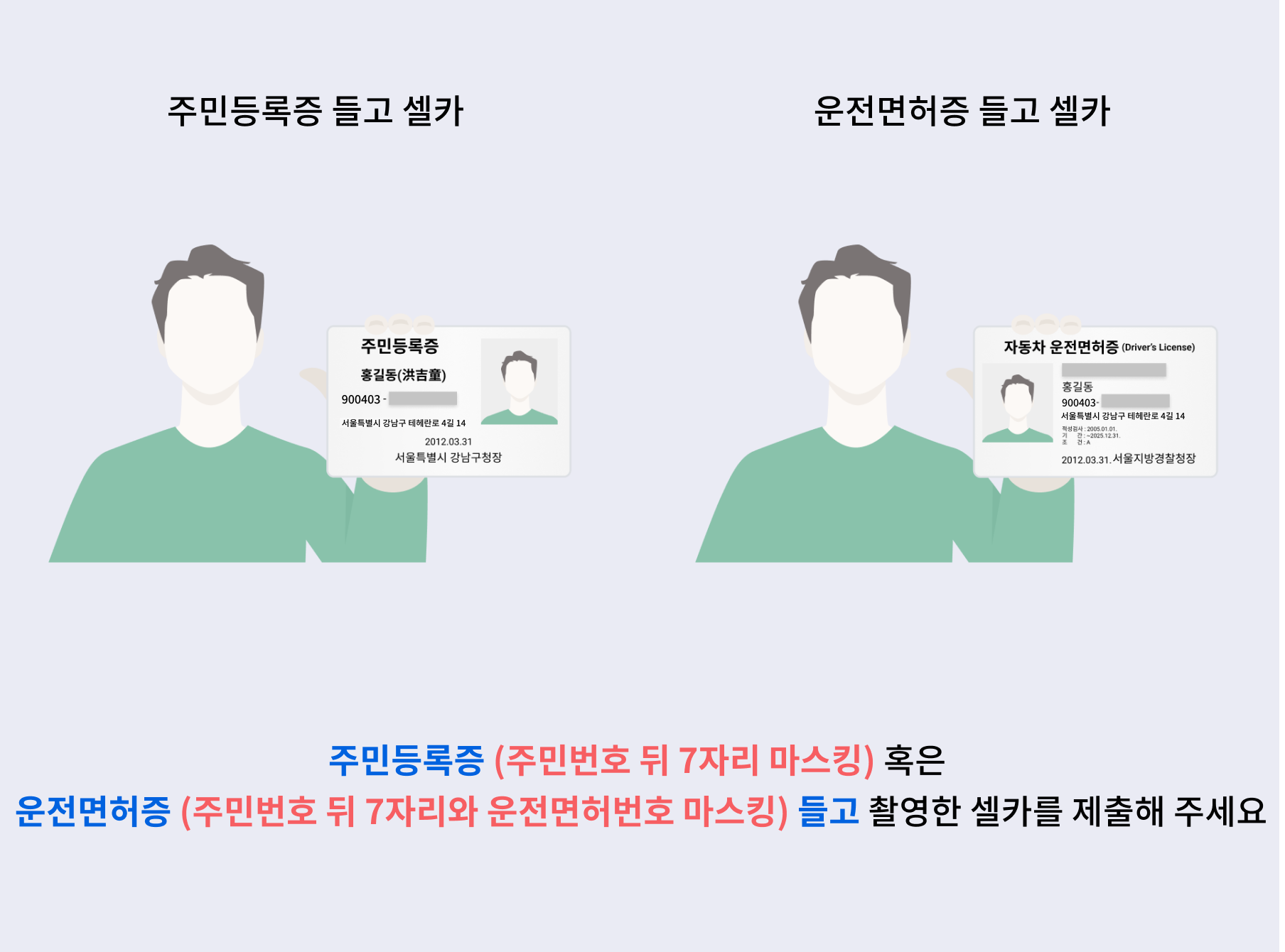 - 신분증(주민등록증 또는 운전면허증 원본)은 이름과 생년월일만 노출해서 제출해 주세요. (주민등록번호 뒤 7자리와 운전면허번호는 가려야 정상 접수 가능)
