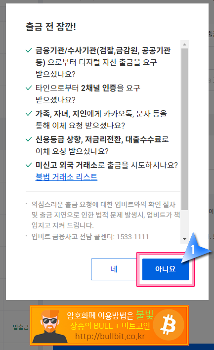 4. 출금 공지사항입니다. '아니요'를 클릭합니다.