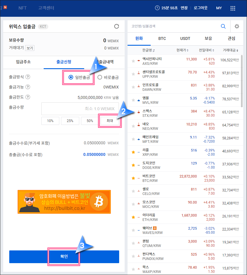 2. 일반출금을 선택, 출금수량은 '최대'를 클릭후, 하단의 "확인" 버튼을 누릅니다.