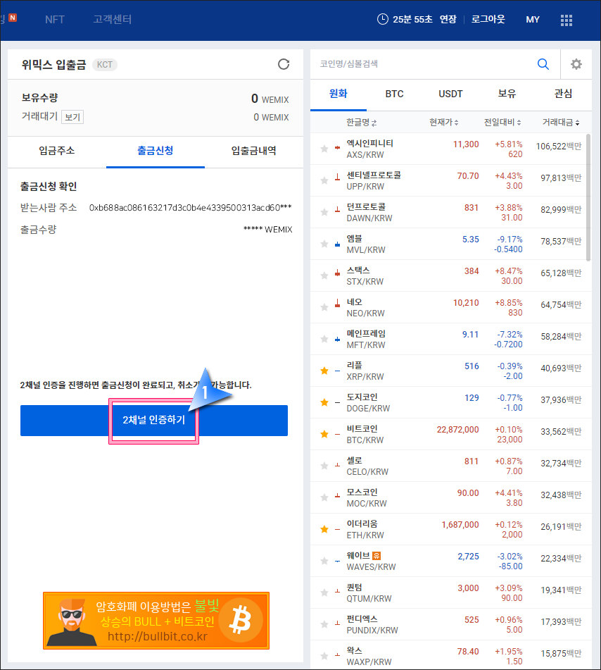 고객확인제도 시행에 따라 2022년 1월 24일 부터 인증이 완료된 외부지갑의 주소로만 출금이 가능하게됩니...