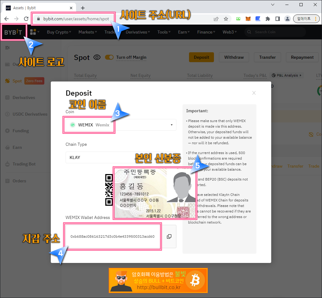 바이비트에 있는 위믹스 입금주소(Bybit - Spot - wemix 검색 - Deposit 화면) 화면을 모니터에 켜놓고 본인의 신분증을 모니터에 대고 사진을 촬영해야 합니다. 이때, 신분증 주민등록번호 뒷자리와 발행일자는 안보이게 스티커 등으로 붙인후 촬영합니다.