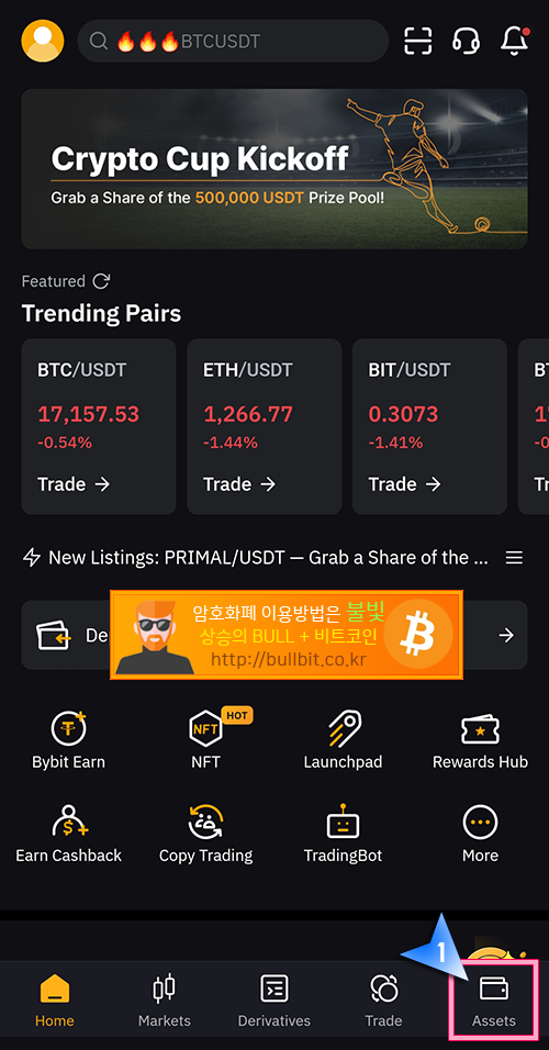 1. 바이비트 모바일 앱 우측 하단의 Assets를 클릭합니다.