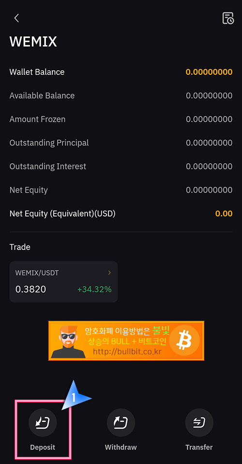 5. 위믹스 코인 결과창 하단의 Deposit(입금) 버튼을 클릭합니다.