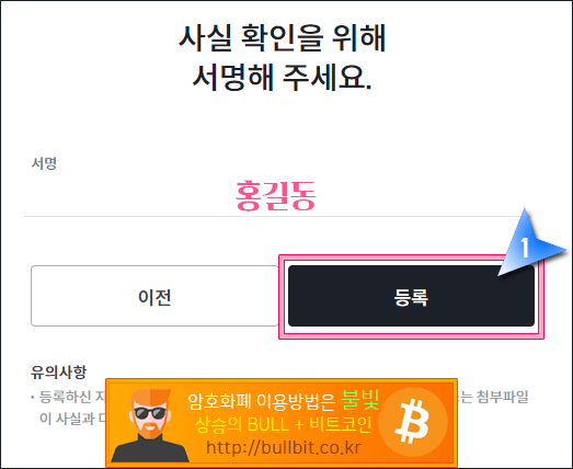 6. 사실 확인을 위해서 본인의 이름을 입력후 "등록" 버튼을 누릅니다.