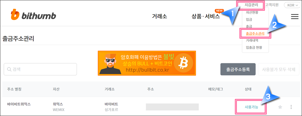 7. 출금주소 등록후에는 거래소에서 심사기간이 필요하며 하루정도 소요됩니다. 출금주소가 사용가능한 상태가 되었는지 확인하려면 "지갑관리-출금주소 관리"를 클릭해서 등록한 바이비트 위믹스 출금주소의 상태가 "사용가능"으로 나타나야 출금이 가능합니다.