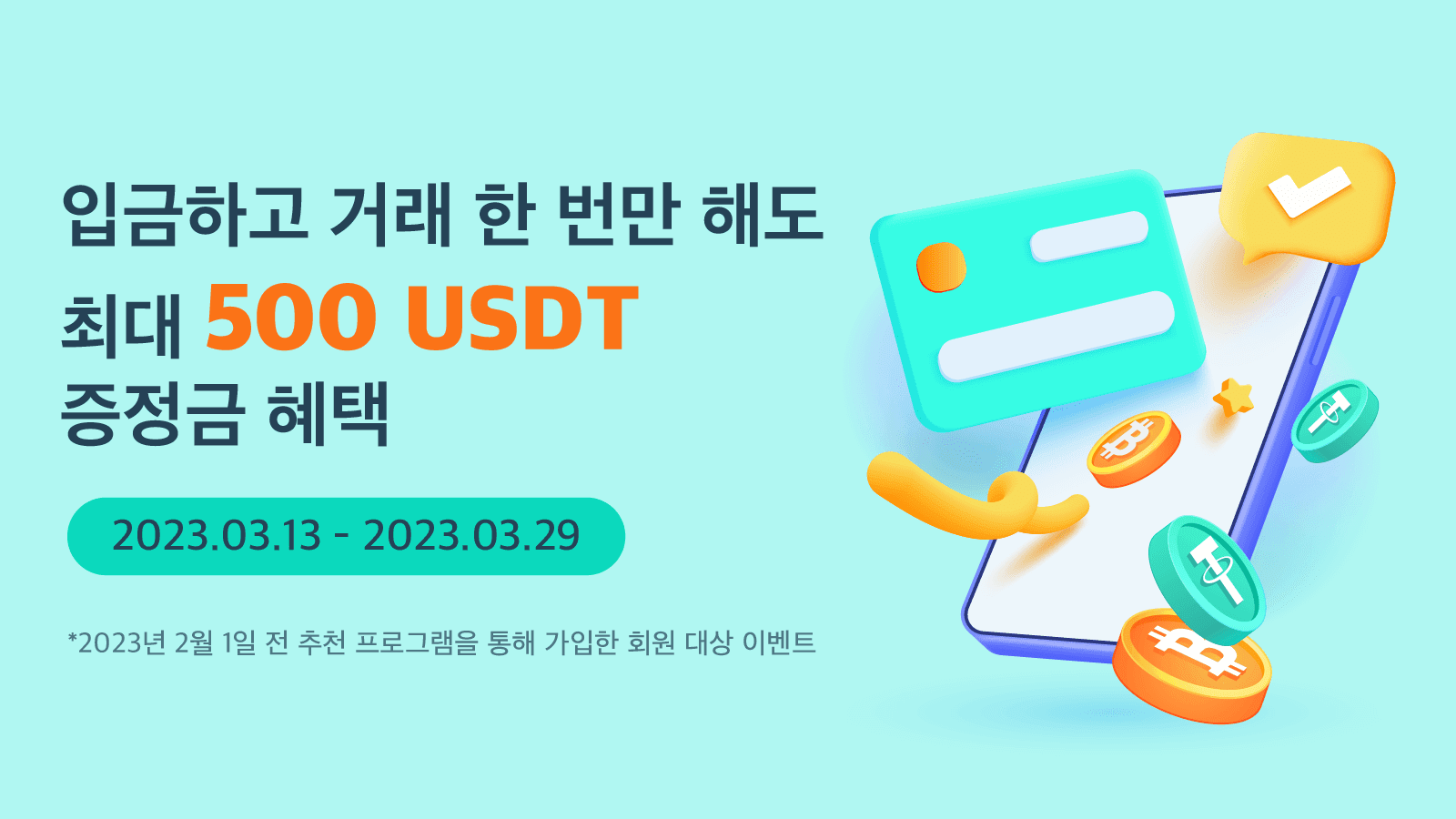 입금 20,000 USD + 거래 한 번 진행 : 500 USDT