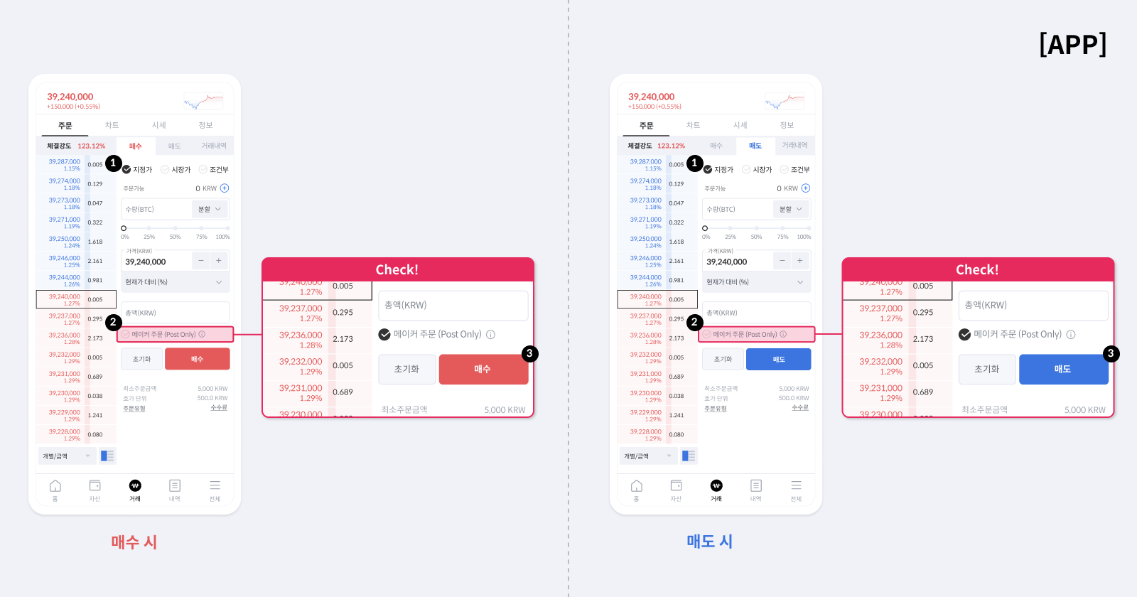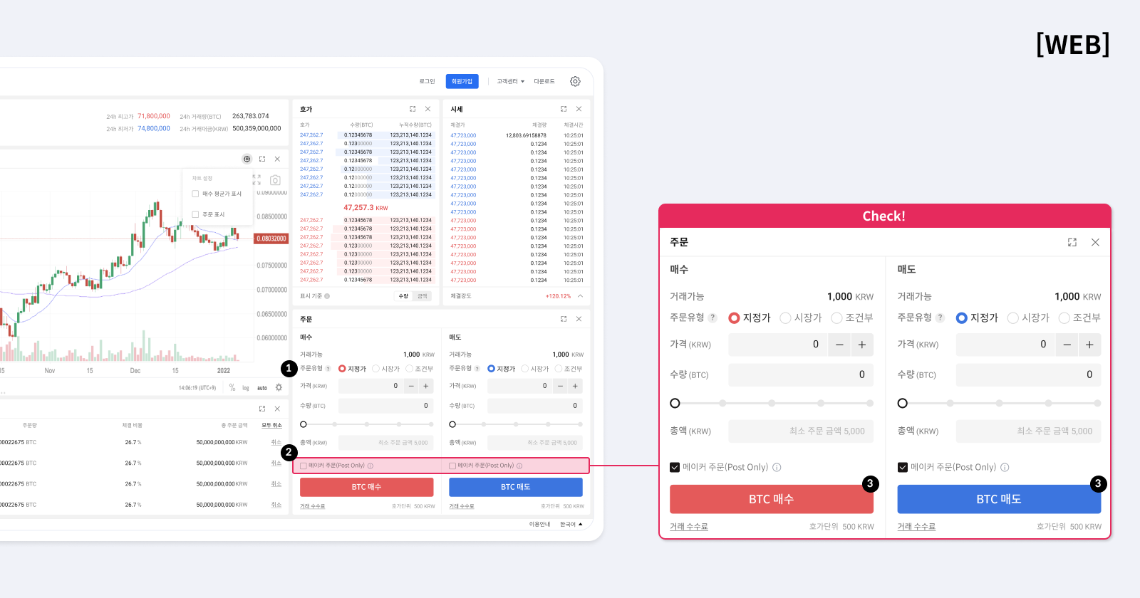①지정가(주문유형), 수량, 가격 입력 > ②메이커 주문(Post Only) 체크 확인 > ③매수 또는 매도 버튼 클릭