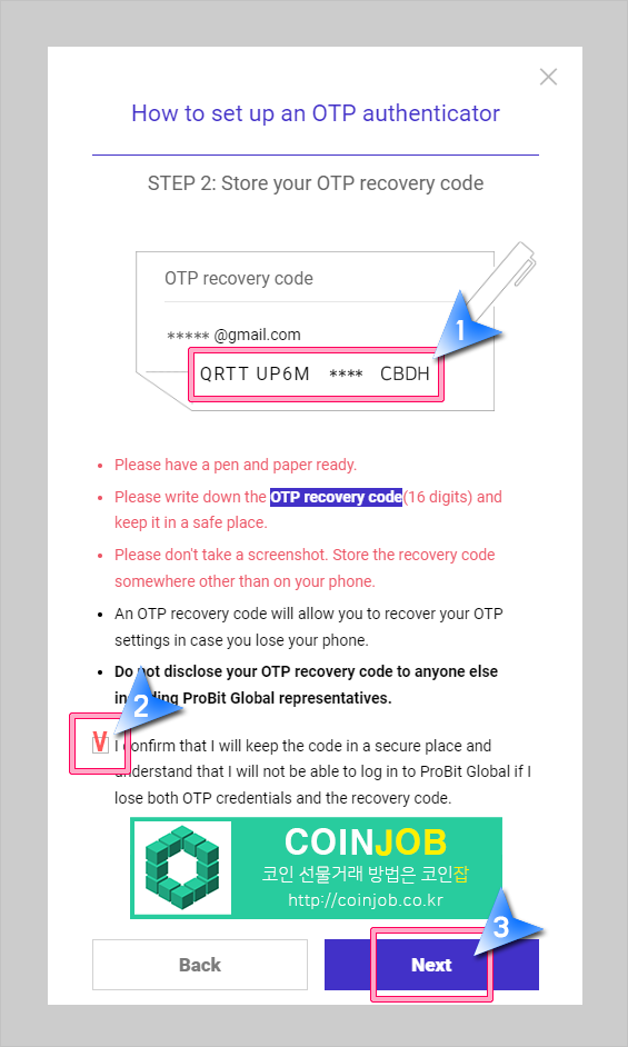 14. OTP 복구 코드입니다. 혹시 휴대폰을 포맷했거나 분실했을 경우에 다시 프로비트 OTP를 복구할 수 있는 코드이니 반드시 메모를 해서 보관하시기 바랍니다. 아래에 체크하시고 Next를 클릭합니다. 또한 바로 뒤의 과정에서도 복구코드를 다시 입력해야 하니 반드시 메모하세요.