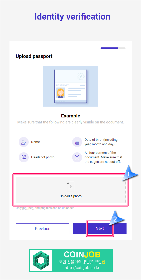 25. 빛반사가 되지 않도록 선명하게 신분증을 촬영후 업로드 해주시고 Next를 클릭합니다. 정상적으로 진행되었다면 대략 30분에서 몇시간만 기다리시면 KYC 신분인증이 완료되어 코인을 입금하여 거래할 수 있습니다. 경우에 따라서는 신분증 인증에 1일 이상이 소요되기도 합니다.