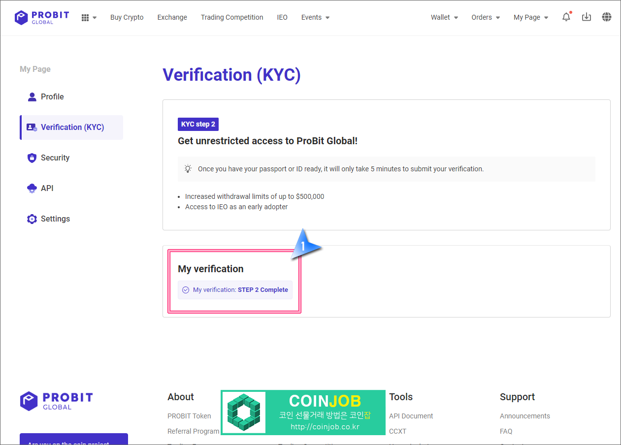 26. 신분인증이 완료되면 이메일로도 인증메일이 날라옵니다. 확인후 프로비트 우측 상단의 My Page를 선택후, Verification을 클릭하시면 인증여부를 확인할 수 있습니다.