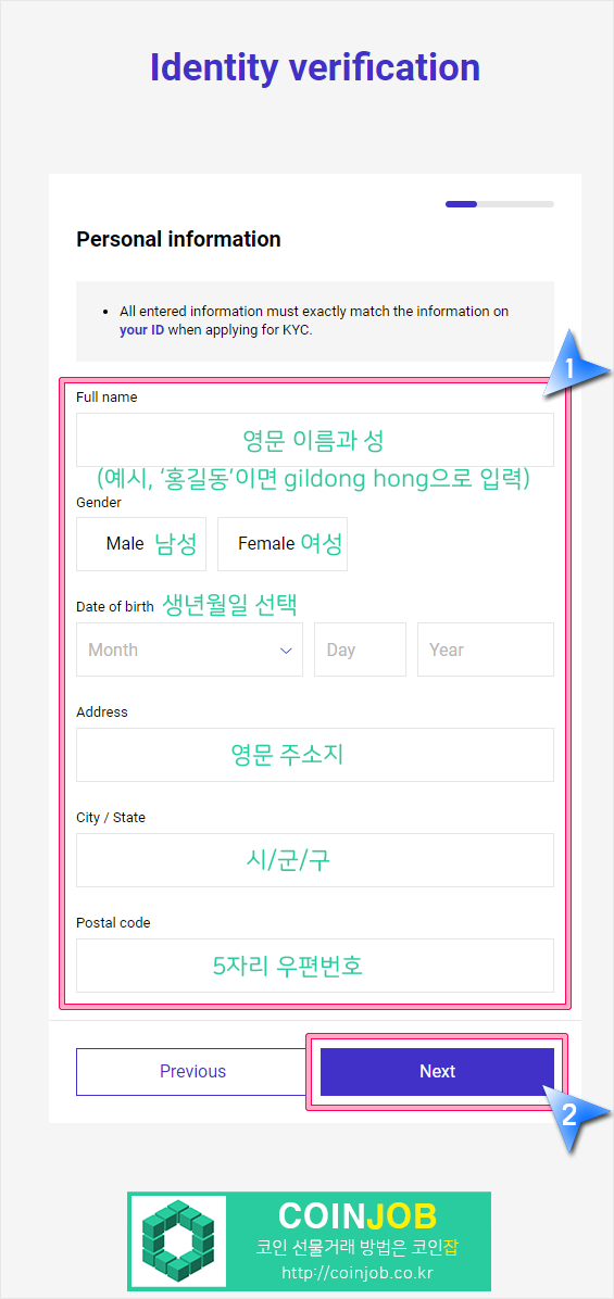 22. 영문 이름과 성을 써주시고, 남성이라면 Male를 선택, 여성이라면 Female를 선택합니다. 생년월일을 선택하시고 주소와 우편번호를 입력후 Next를 클릭합니다.