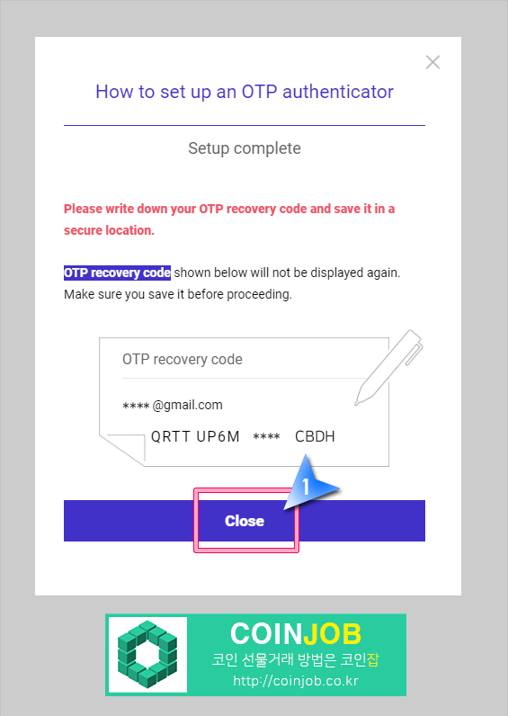18. OTP 설정이 완료되었다면 Close를 눌러줍니다.