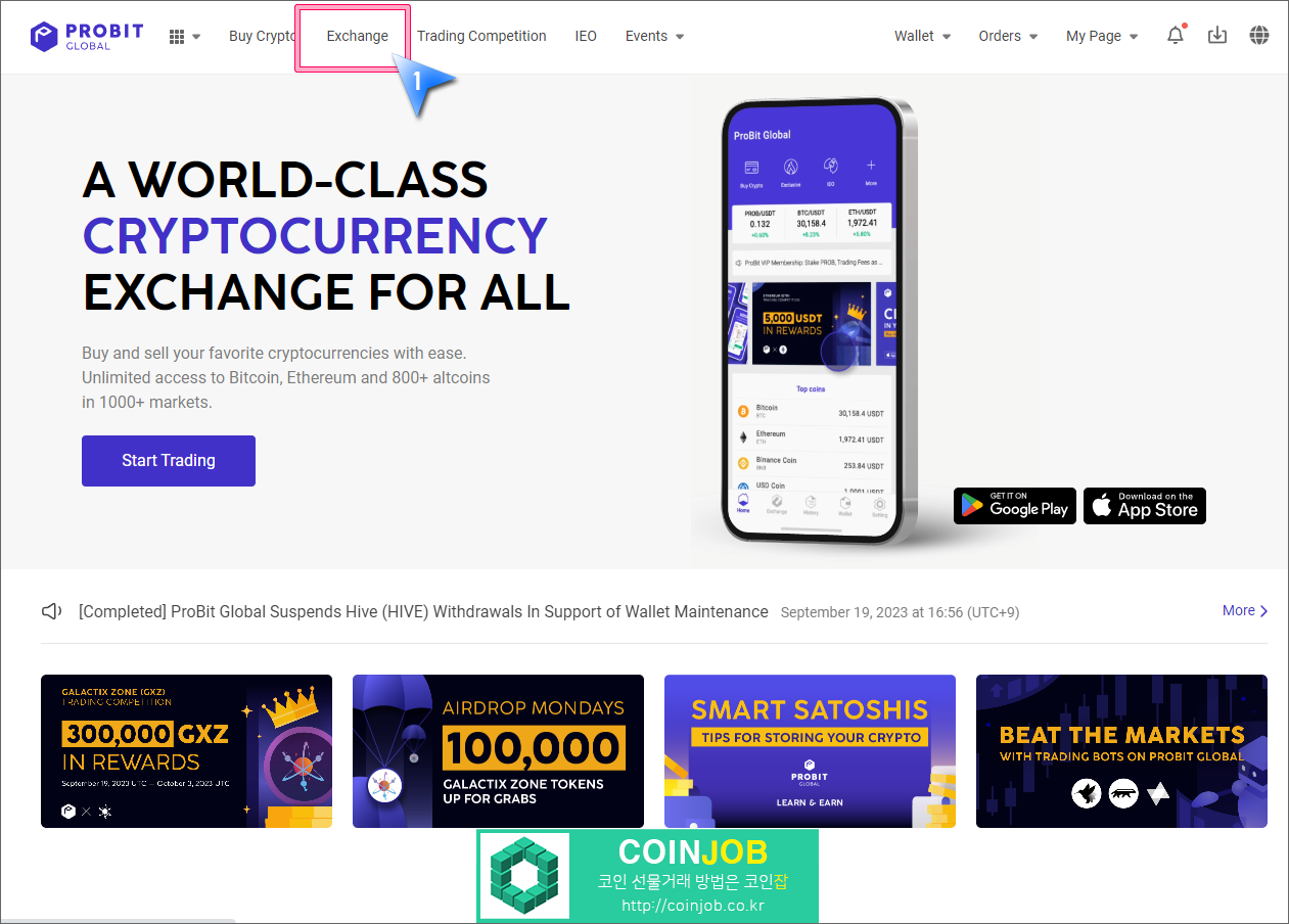1. 프로비트 상단의 Exchange(거래)를 클릭합니다.