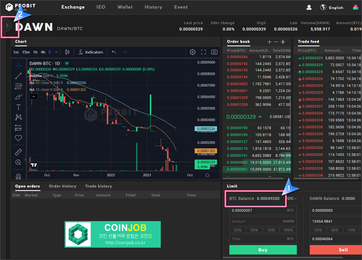 2. 저는 현재 던프로토콜 거래화면인데 처음에는 BTC 거래화면입니다. 왼쪽의 화살표를 클릭해서 검색창에 DAWN을 검색해서 DAWN/BTC를 클릭하시면 아래 이미지처럼 던프로토콜 거래화면을 볼 수 있습니다.