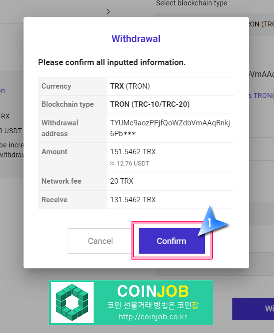 14. 출금 내용을 확인후 "Confirm"을 클릭합니다.